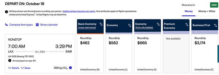 The standard fare for a round-trip flight from Los Angeles International Airport (LAX) to Newark Liberty International Airport (EWR) in mid-October is $562 (excluding taxes and fees) in economy. With this offer, the base price drops to $505.80.
