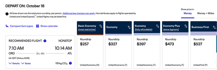 UNITED AIRLINESFor a shorter route from Chicago's O'Hare International Airport (ORD) to Hartsfield-Jackson Atlanta International Airport (ATL), you could save almost $33, reducing the base fare from $327 to $294.30 with this promotion.