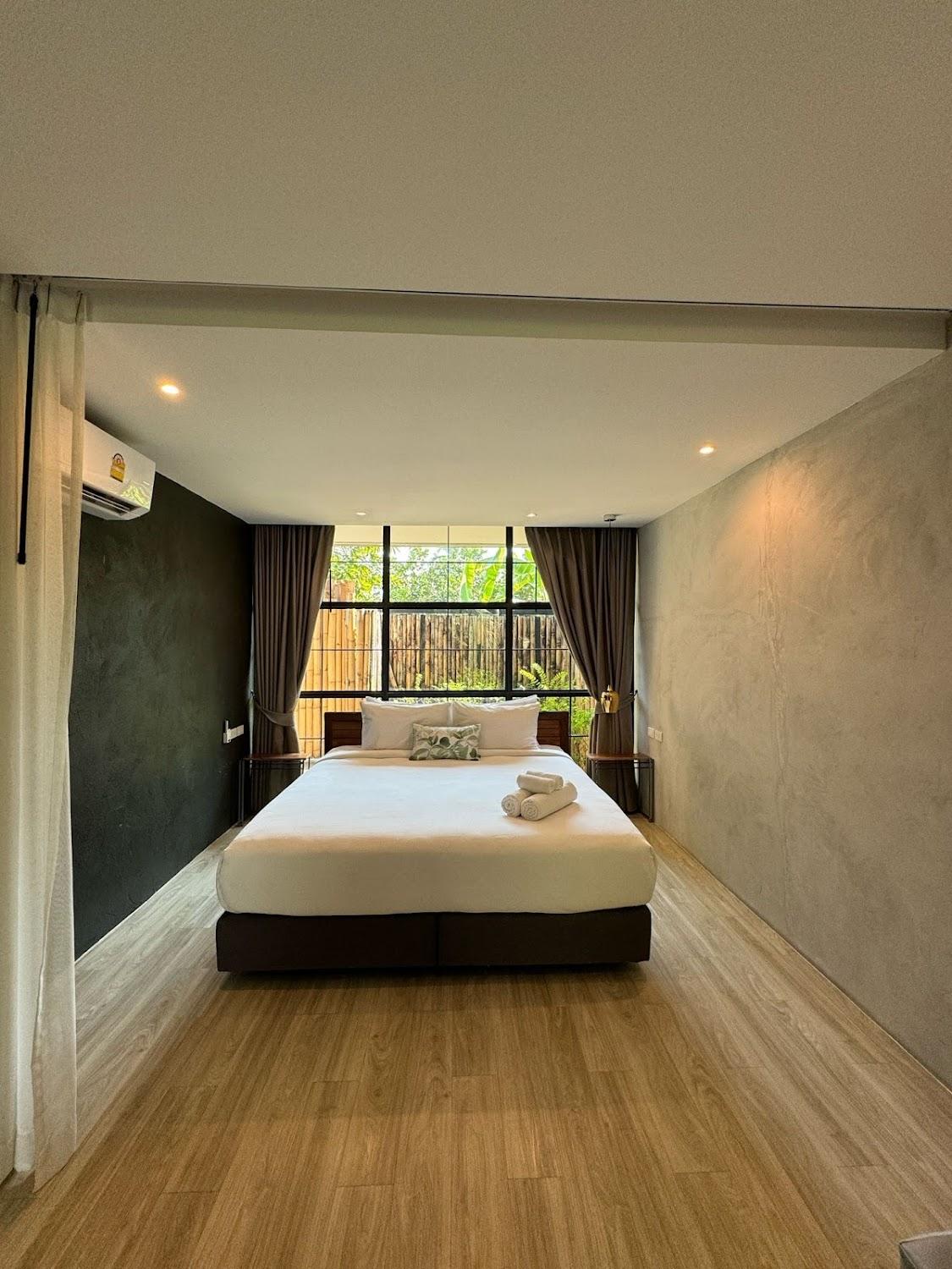 Stayed on 28 Oct '23 Chose this place because of high rated reviews. We stayed for 4 people in family room 105 Gajib. It is a small, warm hotel, perfectly decorated and cute. There are 9 rooms for 2 people and 1 room for 4 people. The service staff is very good, 5 stars 👍 counter check in is in the restaurant itself. The style of the hotel is decorated like being in a forest garden. We went in the rainy season and it was wet and humid. The condition of the room was a 2-story duplex. There was some musty smell in the room. The air conditioner is cool throughout the common area. room on the ground floor and bedroom on the 2nd floor The ground floor has a toilet, dishwasher, coffee set, dining table, and sofa. TV doesn't have Netflix, but it doesn't affect us much. The ground floor is a space that we like because we can live together. You can see through the glass wall outside the room. The view of the trees is very pleasing to the eyes. The back door opens and there is a sofa to sit on and strong wifi can be used in the entire room. On the 2nd floor there are 2 bedrooms, both of which have their own bathrooms.👍 The master bedroom has a very large bathroom. Clearly separate wet and dry sections. I really like the bathroom.💗 Shower, warm water, strong and consistent, very good. In both bedrooms, there are mirror walls that look out comfortably because of the trees. But strangely, there aren't many mosquitoes. The bedding set does not smell. Clean towels The brightness of the lights in the room is just right. The only problem is that the stairs to the 2nd floor may be difficult for the elderly and families with small children. We ordered dinner from the hotel to have it delivered to our room. The kitchen closes at 5 p.m. The price isn't too expensive and it's delicious. But actually there are a lot of restaurants and cafes around the hotel. You can walk to it. Oh, there are free bicycles to ride. You can ride outside the school, but you have to be careful because there are a lot of cars. The road is narrow and secretly dangerous. Parking can accommodate approximately 12 cars. Breakfast is a set meal. Choose 1 set per person from 3 types: pork porridge, soup dumplings, American breakfast, and choose a drink. 1 such as coffee, Thai tea, chocolate, all delicious besides the set There are other things that you can eat, such as grilled pork, stuffed snacks, Patongko, and fruit. It doesn't seem like a lot, but it's delicious. Overall, I like staying here. But the price of accommodation compared to the facilities Still looks a little expensive. (Personal opinion)